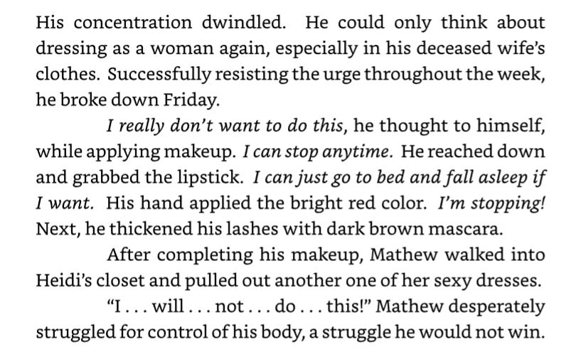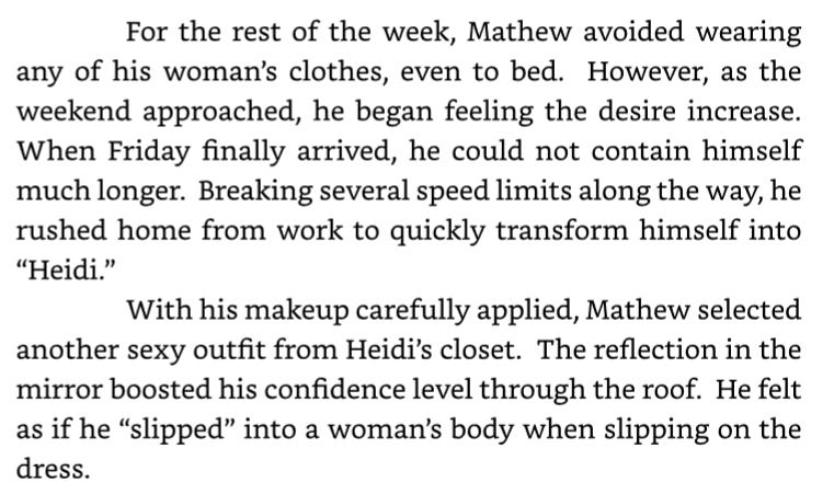 The story ends with Mathew fully transformed into Heidi, inhabiting her body. A man slowly being transformed into a deceased wife or lover is a common trope among ‘forced feminization’ fiction.