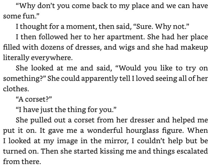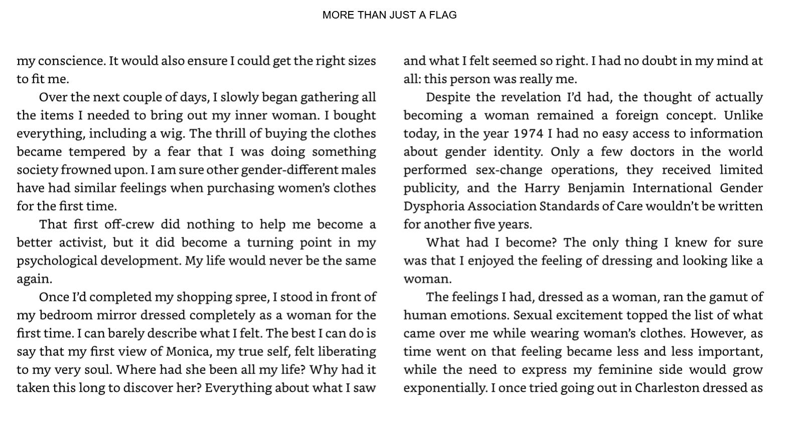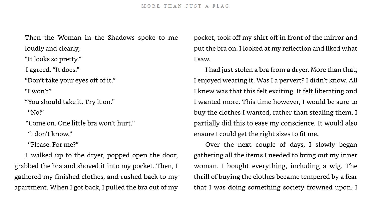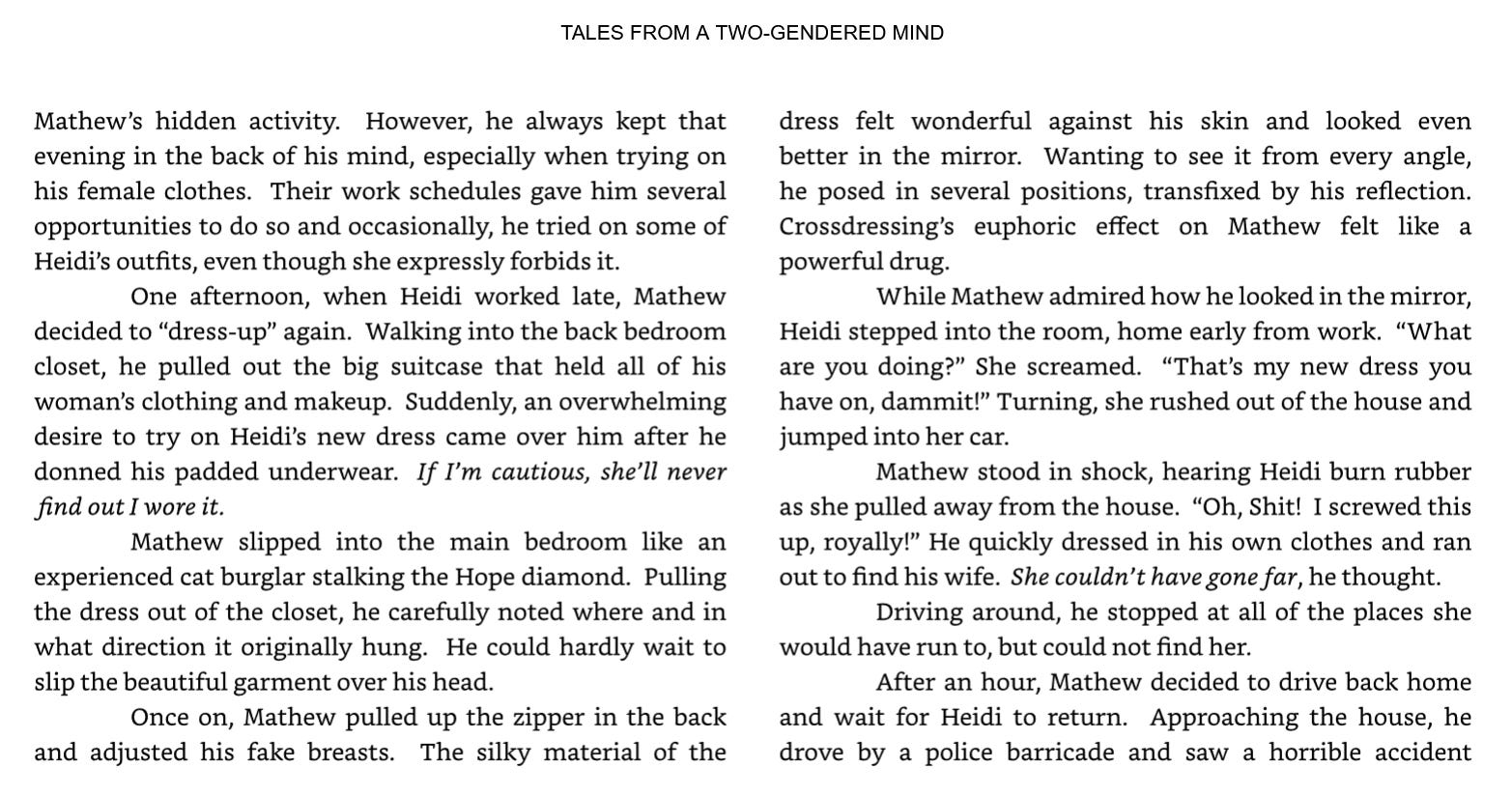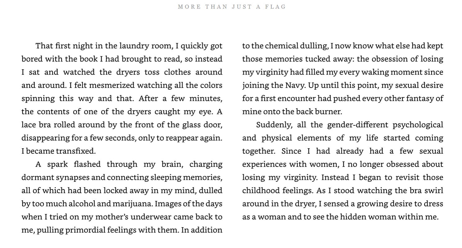 “Images of the days when I tried on my mother’s underwear came back to me, pulling primordial feelings with them… the obsession of losing my virginity had filled my every waking moment… Up until this point, my sexual desire for a first encounter had pushed every other fantasy of mine onto the back burner. As I stood watching the bra swirl around in the dryer, I sensed a growing desire to dress as a woman and to see the hidden woman within me.