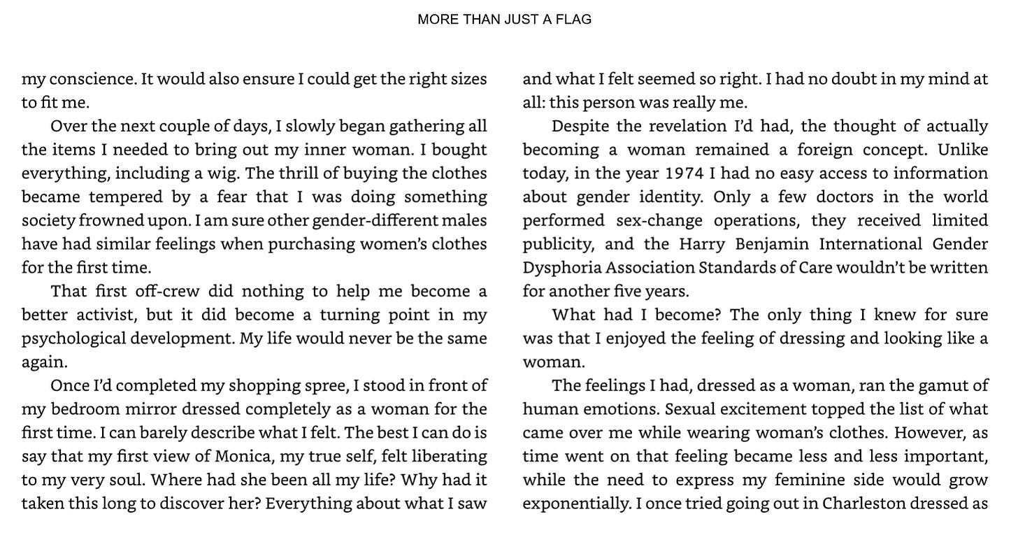 “My need to appear as a woman didn’t replace my need to have sexual relationships with women,” Helms attests, while explaining in great detail his sexual proclivities and relationships with women.
