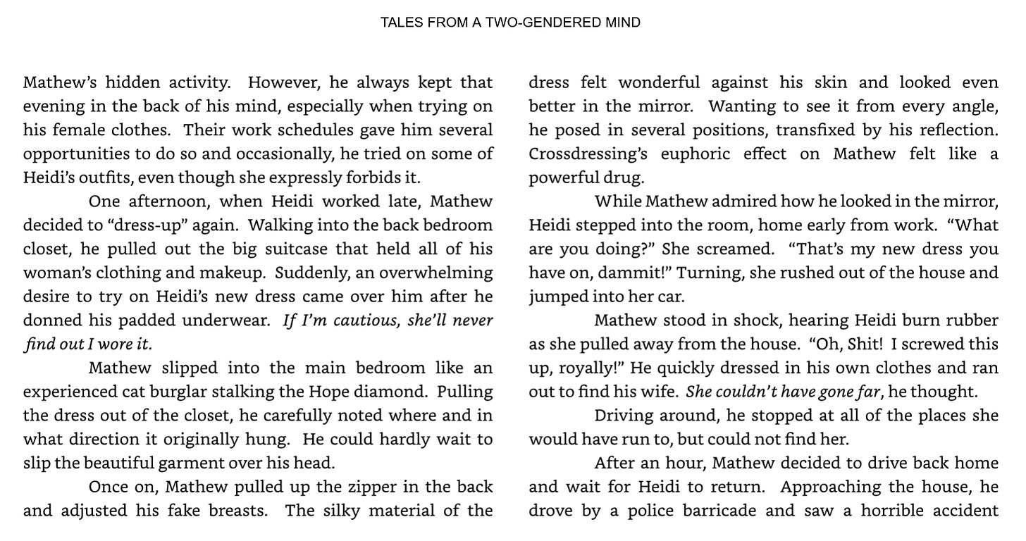 In a story called “Sexual Harassment”, a man with a cross-dressing fetish named Mathew begins stealing his wife Heidi’s clothing to satisfy his fetish. Eventually, Mathew confesses to Heidi, and, furious, she forbids him from wearing her clothing and promises that “even death won’t protect you from my anger”.