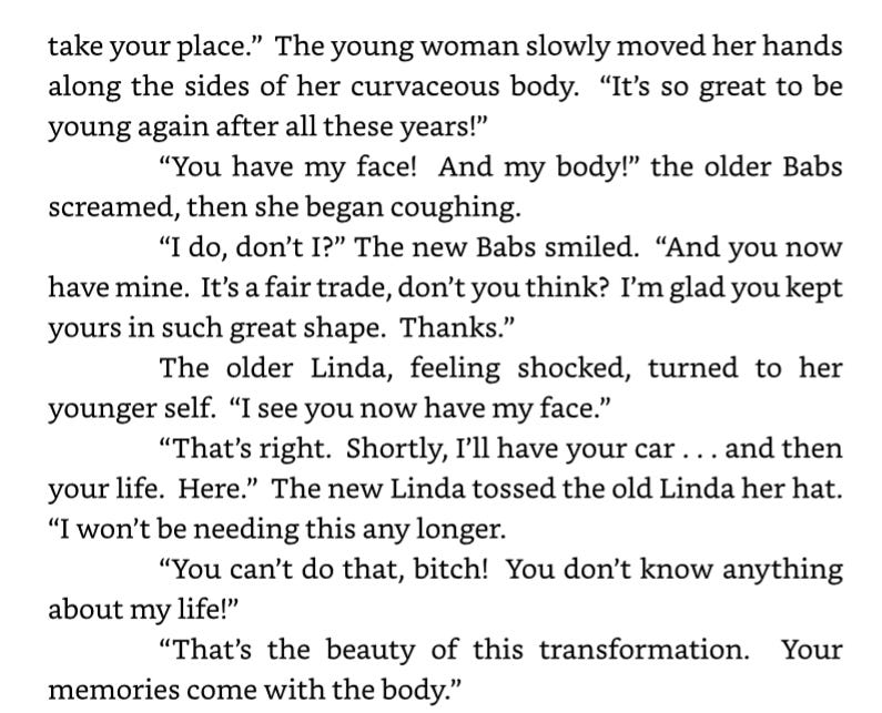 The young women begin aging rapidly, even as the two old women become younger. When the ‘transformation’ is complete, they have swapped bodies.