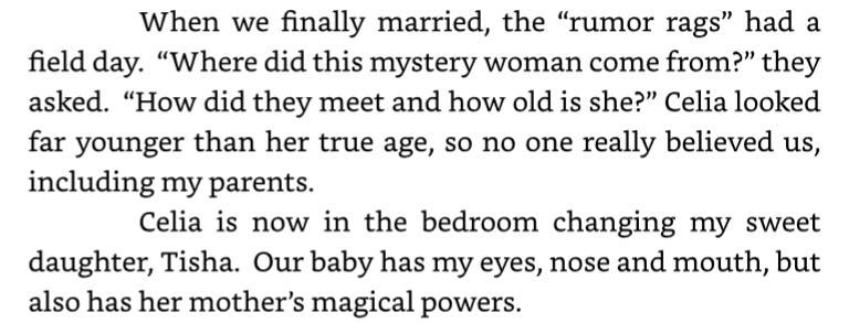The child reveals herself to be a witch who claims to be older than she appears; among her powers is the ability to age very slowly, causing her to look “far younger than her true age.” The man marries her and they have a daughter: “Our baby… has her mother’s magical powers.”