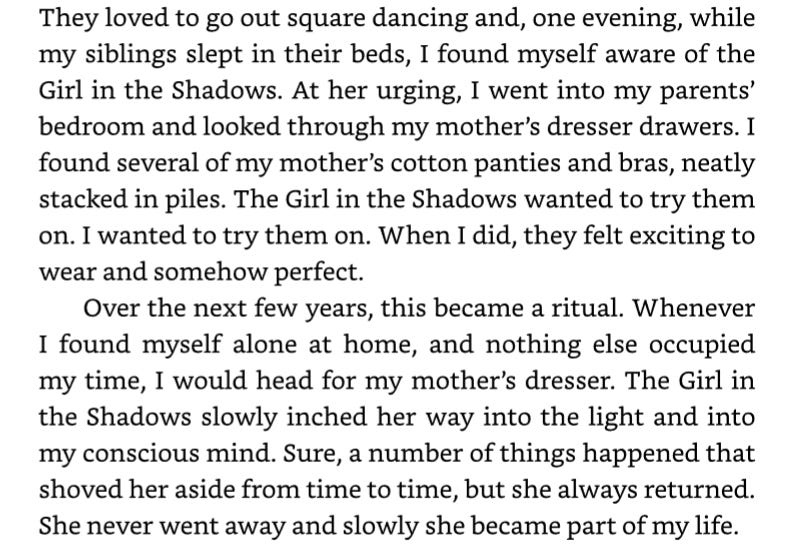“I went into my parents’ bedroom and looked through my mother’s dresser drawers,” Helms writes, “I found several of my mother’s cotton panties and bras, nearly stacked in piles. The ‘Girl in the Shadows’ wanted to try them on. I wanted to try them on. When I did, they felt exciting to wear.”