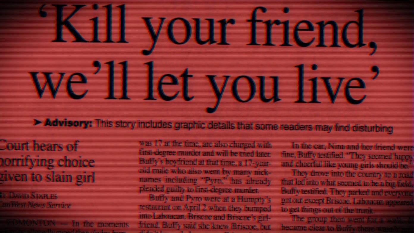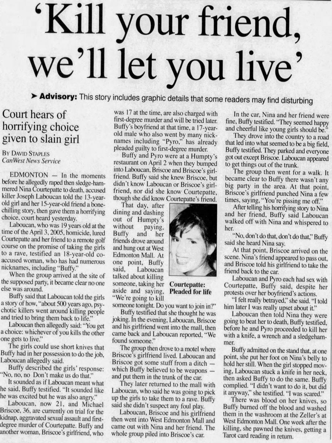 On April 3, 2005, the group lured Courtepatte away from the mall by promising to take her to a rave. Instead, they drove her to a golf course where Buffy testified that ringleader Laboucan had told the two girls, “You get a choice: whichever of you kills the other gets to live.”