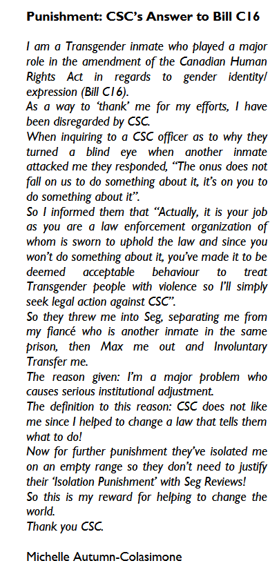 “CSC (Correctional Services Canada) does not like me since I helped to change a law that tells them what to do!” Williams boasted. “I am a transgender inmate who played a major role in the amendment of the Canadian Human Rights Act in regards to gender identity / expression (Bill C-16).”