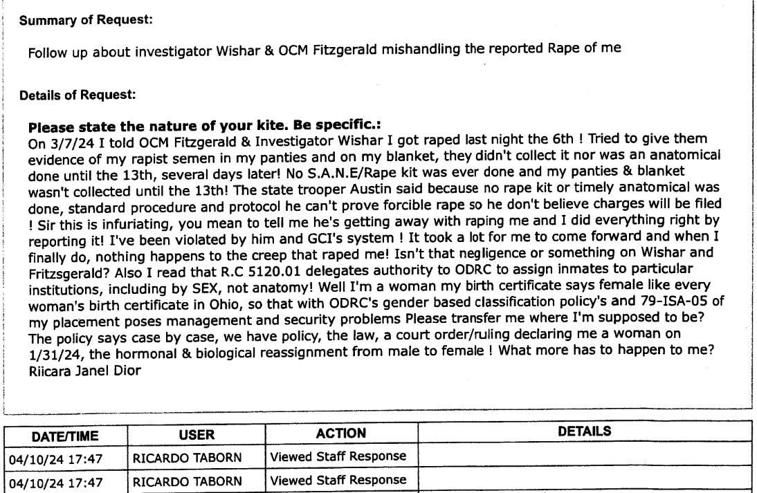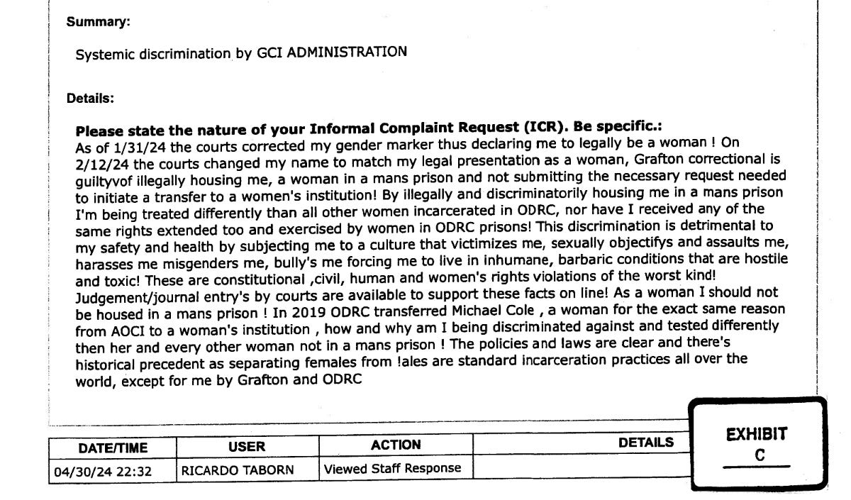“Also I read that R.C 5120.01 delegates authority to ODRC to assign inmates to particular institutions, including by SEX, not anatomy! Well I’m a woman my birth certificate says female like every woman’s birth certificate in Ohio… Please transfer me where I’m supposed to be? The policy says case by case, we have policy, the law, a court order / ruling declaring me a woman on 1/31/24, the hormonal and biological reassignment from male to female! What more has to happen to me?”