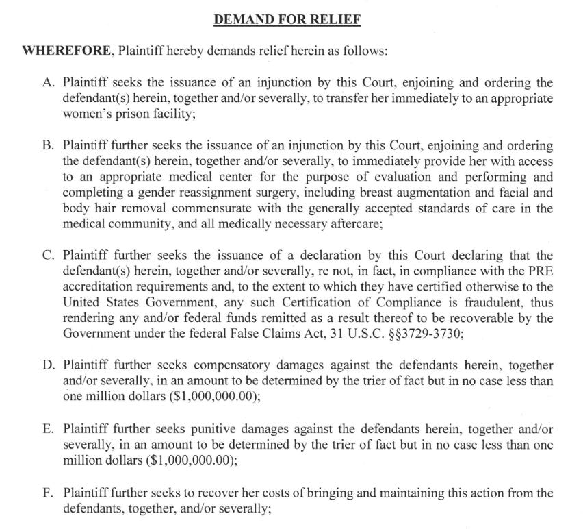 “By illegally and discriminatorily [sic] housing me in a mans [sic] prison, I’m being treated differently than all other women incarcerated in ODRC… This discrimination is detrimental to my safety and health by subjecting me to a culture that victimizes me, sexually objectifys [sic] and assaults me, harasses me misgenders me… In 2019 ODRC transferred Michael Cole, a woman, for the exact same reason from AOCI [Allen Oakwood Correctional Institution] to a woman’s institution, how and why am I being discriminated against and tested [sic] differently then [sic] her!”