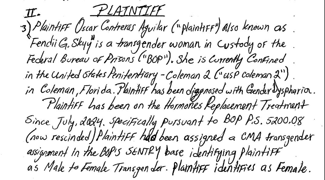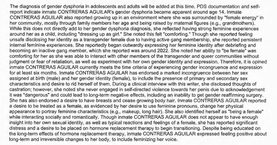 The document goes on to state, “Inmate Contreras Aguilar’s gender dysphoria became apparent around age 14. Inmate Contreras Aguilar also reported growing up in an environment where she was surrounded by ‘female energy’ in her community, mostly through family members her age and being raised by maternal figures. While this does not directly add to her gender dysphoria diagnosis, she reflected having strong feminine experiences around her as a child, including ‘dressing up as a girl.’ She noted this felt ‘comforting.'”
