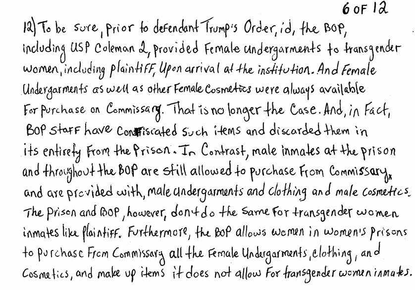 “Prior to Trump’s order, the BOP, including USP Coleman 2, provided female undergarments to transgender women, including plaintiff, upon arrival at the institution, and female undergarments as well as other female cosmetics were always available for purchase on commissary,” Contreras Aguilar states. “That is no longer the case.”