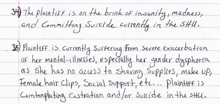 “Plaintiff is currently suffering from severe exacerbation of her mental illnesses, especially her gender dysphoria, as she has no access to shaving supplies, make up, female hair clips, social support, etc,” reads the complaint.