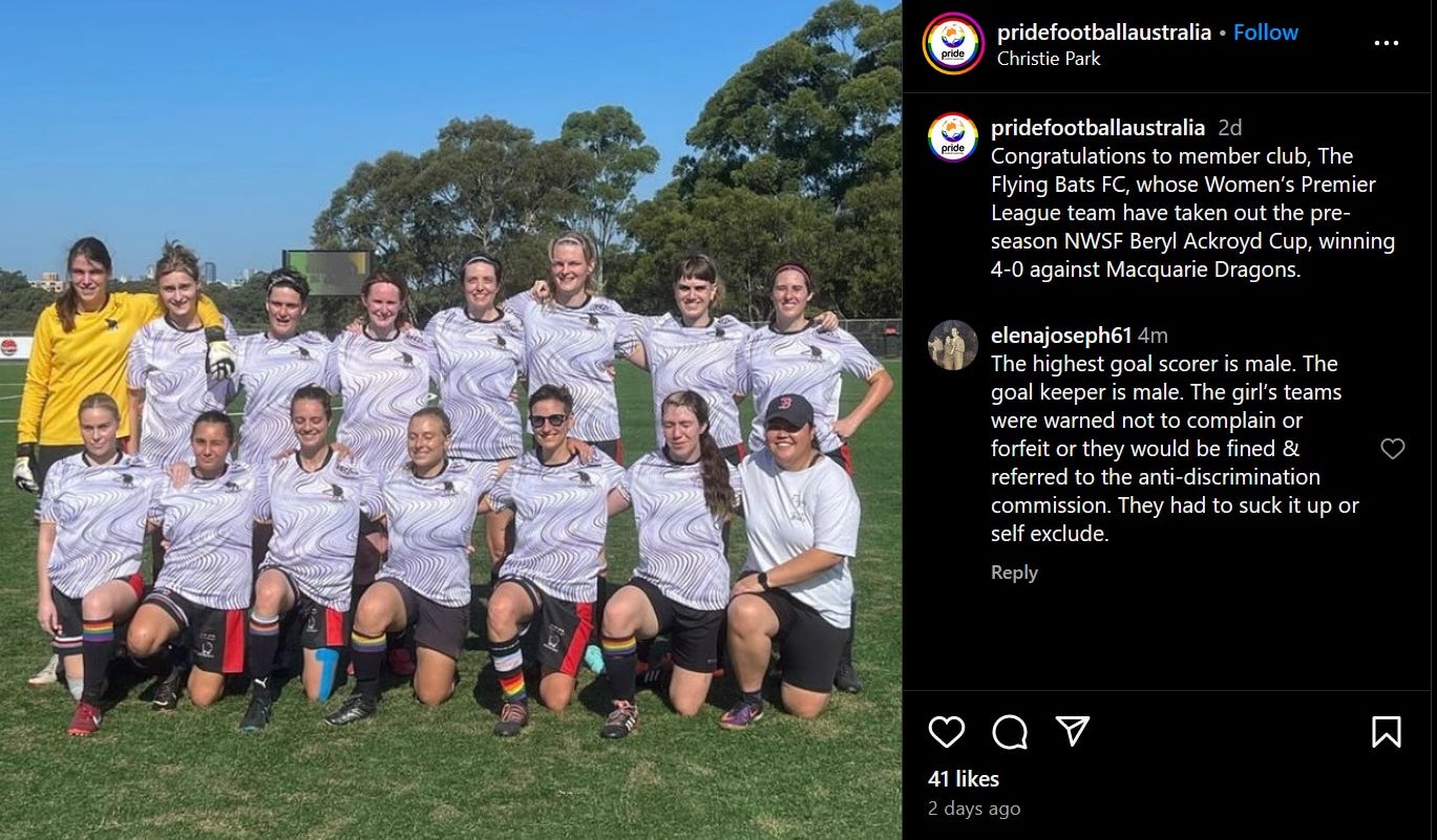 The Flying Bats Football Club secured a 4-0 victory against the Macquarie Dragons on March 24, and of their five trans-identified players, the highest goal-scorer is a male trans activist who injured two female players during a match last year.