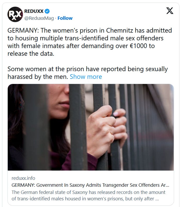 In January, the Federal States’ Ministry of Justice confirmed that at least five trans-identified male inmates had physically assaulted female inmates on several occasions, and that four of these men had been sexually aggressive. The admission was made in response to an information request from the AfD filed in December. Previously, all federal states had denied sexual attacks by imprisoned trans-identified men when asked by media.