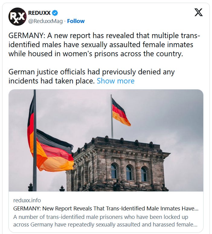 GERMANY: Two Trans-Identified Male Inmates Housed in Women’s Prisons Were Transferred Out After Threatening Female Inmates, Inquiry Reveals