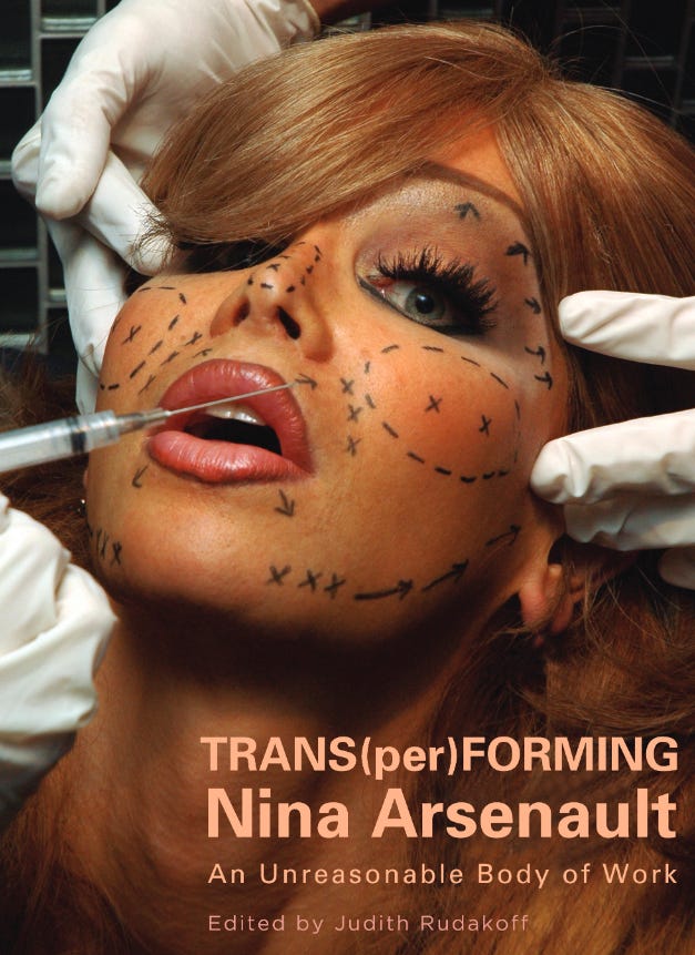 Nina Arsenault’s sadomasochistic vision of womanhood was elevated to the realm of academia when his former professor, Judith Rudakoff, organized the publication of Trans(per)forming Nina Arsenault: An Unreasonable Body of Work (2012). The slim volume includes the script of Arsenault’s play The Silicone Diaries, where he waxes poetic about plastic surgery, alongside commentary from academics who admiringly reference postmodernists such as Lacan, Butler, and Deleuze, while constructing credibility for Arsenault’s blatant misogyny. This book is revelatory in that directly links Arsenault’s desire to ‘transition’ with pornography and female objectification.