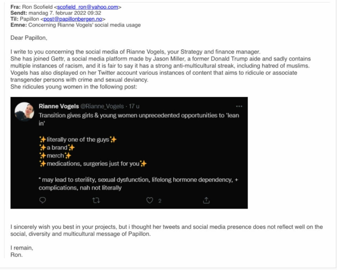 “Transition … may lead to sterility, sexual dysfunction, lifelong hormone dependency, + complications,” wrote Vogels on February 6, 2022. By the following morning, her manager, Leïla Rezzouk, had already received an email about her tweet from a sender using the pseudonym Ron Scofield. The message, written in English as opposed to Norwegian, included a screenshot of Vogels’ tweet and an accusation of racism on the basis that she had an account on Twitter alternative social media platform Gettr.