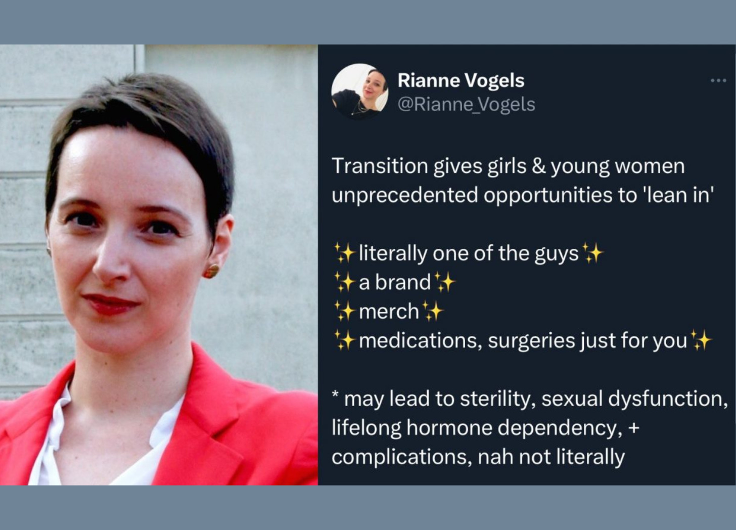 Vogels first found her employment at risk just one day after she posted a tweet critical of the surgical and hormonal transitioning of girls and young women.
