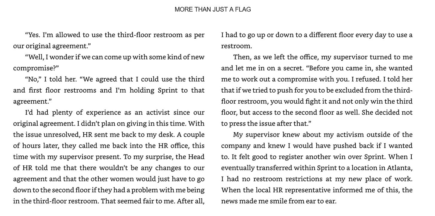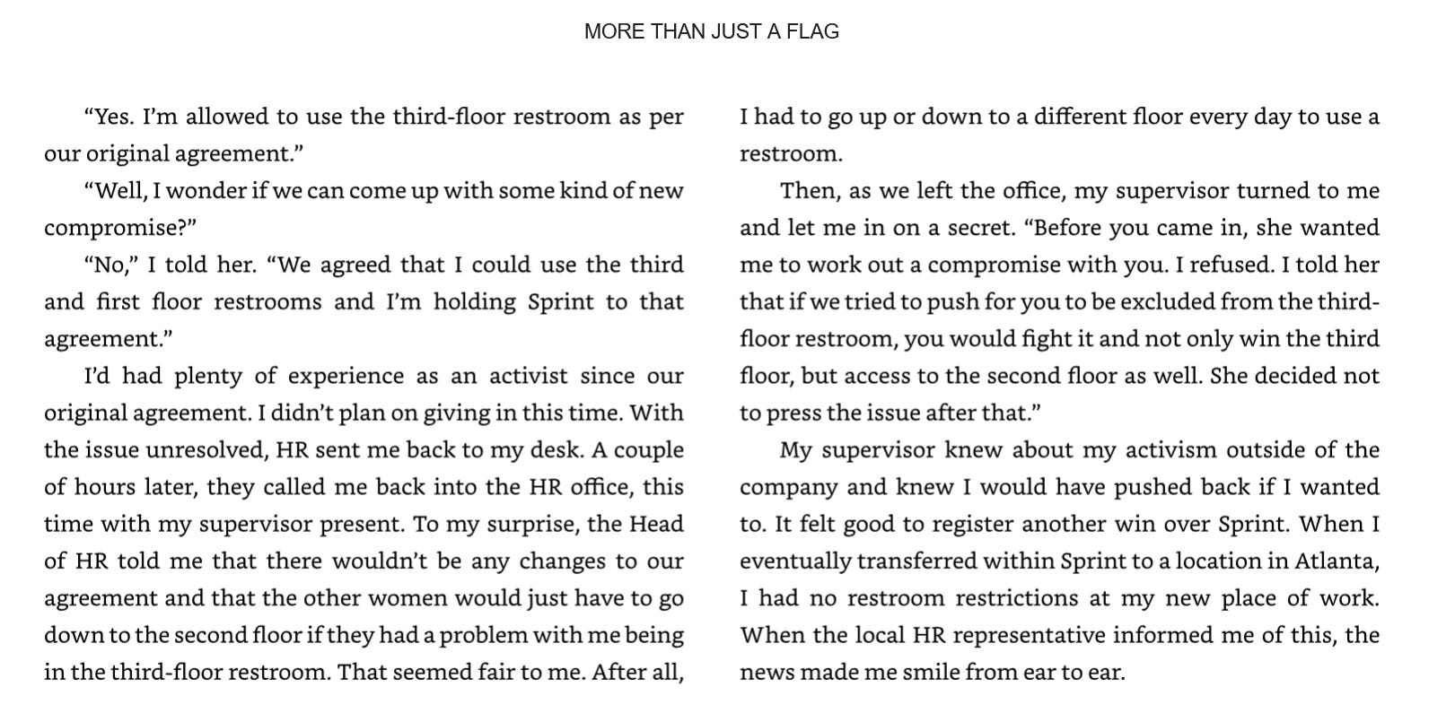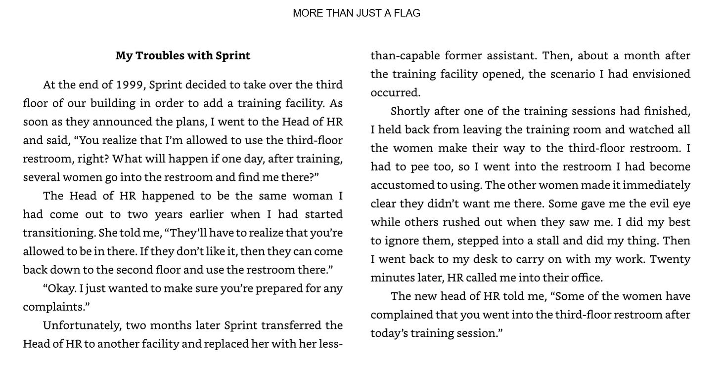 In 1999, still working for Sprint, Helms was notified by the Head of HR that there had been complaints about him using the women’s restroom on the third floor.