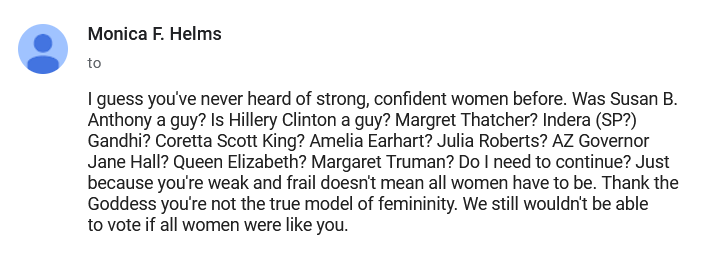 Posts made by Monica Helms in a Usenet newsgroup in 2001 suggest that he believes himself to be a ‘true model of femininity’. He describes being thrilled at being called a “b*tch” by a customer, and compares himself to leading women’s rights campaigners such as Susan B. Anthony and Coretta Scott King.