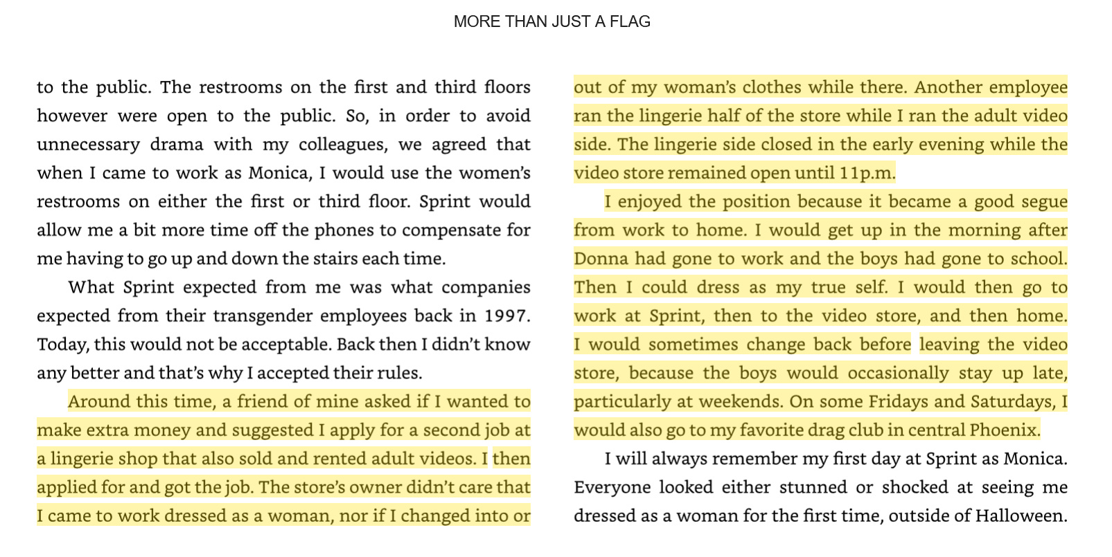 “Around this time [1997], a friend of mine asked if I wanted to make extra money and suggested I apply for a second job at a lingerie shop that also sold and rented adult videos. I then applied for and got the job. The store’s owner didn’t care that I came to work dressed as a woman, nor if I changed into or out of my woman’s clothes while I was there. Another employee ran the lingerie half of the store while I ran the adult video side.