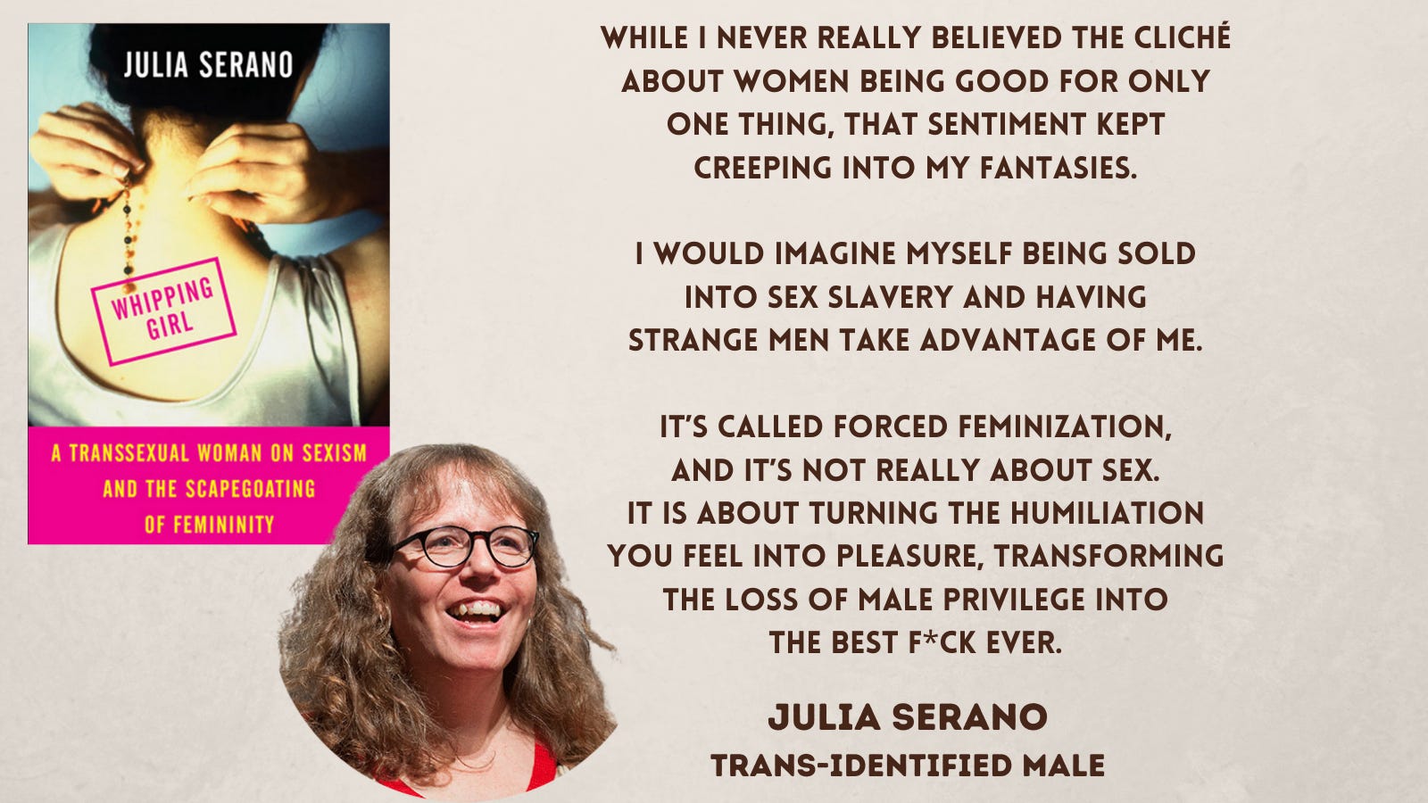 Julia Serano, author of Whipping Girl, has described fantasizing about being sex trafficked. According to Serano, being sold into sexual slavery would allow him to “[transform] the loss of male privilege into the best f*ck ever.”