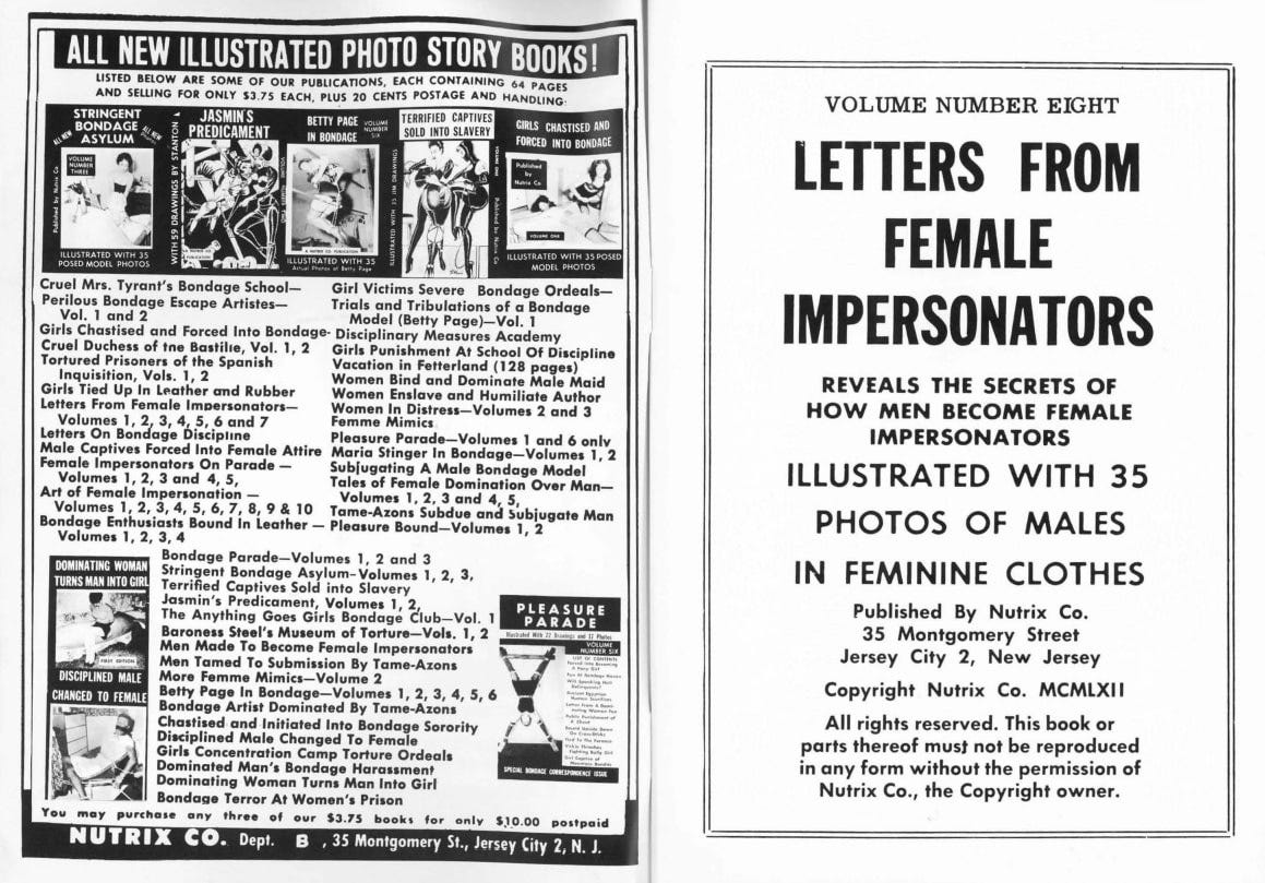 Throughout the early modern organizing of Western cross-dressers during the 60’s - 80’s, men used porn magazines to disseminate and promote this fetish. Books on the sensuality of objects and symbology, manuals on sadomasochism, and female hormones were all sold in the back pages of these publications.