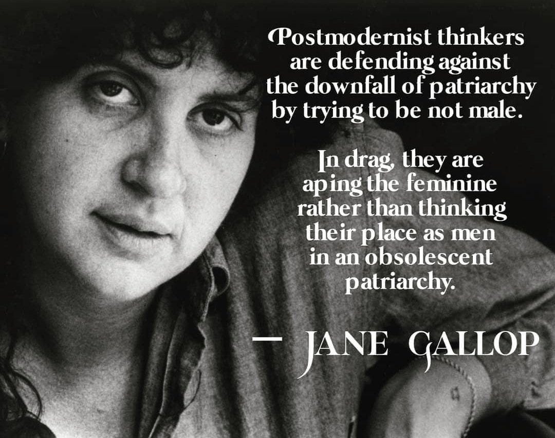 “Postmodernist thinkers are defending against the downfall of patriarchy by trying to be not male. In drag, they are aping the feminine rather than thinking their place as men in an obsolescent patriarchy.”